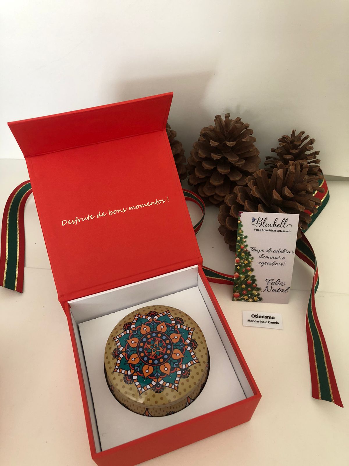 Linda lata decorada 120g (circunferência 6,5cm e altura 4,5cm). Caixa cartonada vermelha com fechamento em imã (11x11x5,5).